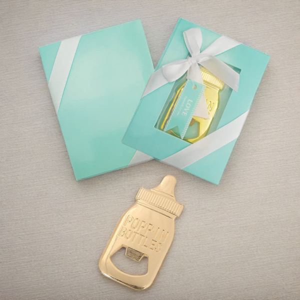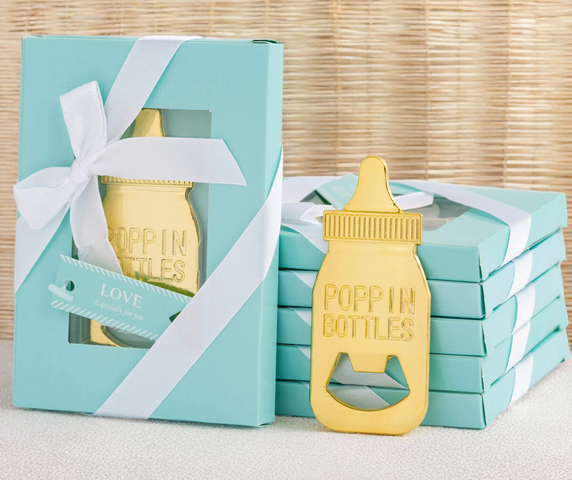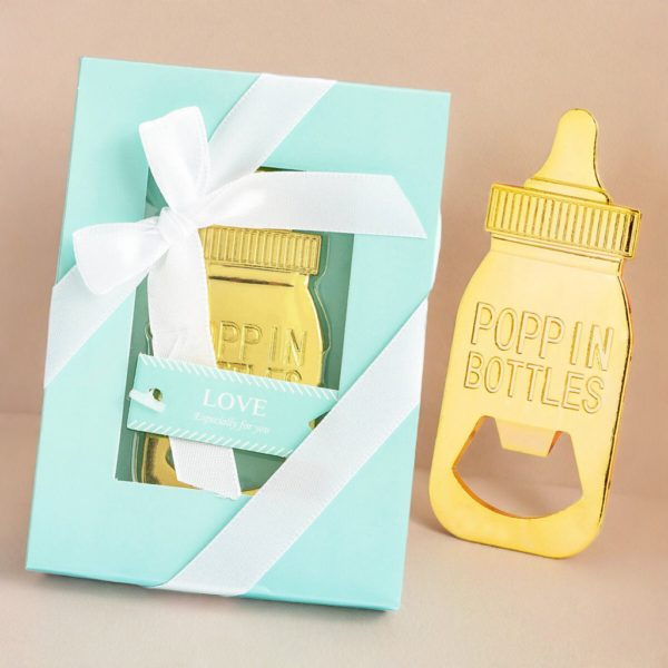 Deze originele bieropener in de vorm van een gouden babyfles is hét perfecte kraamcadeau voor de trotse nieuwe papa.
