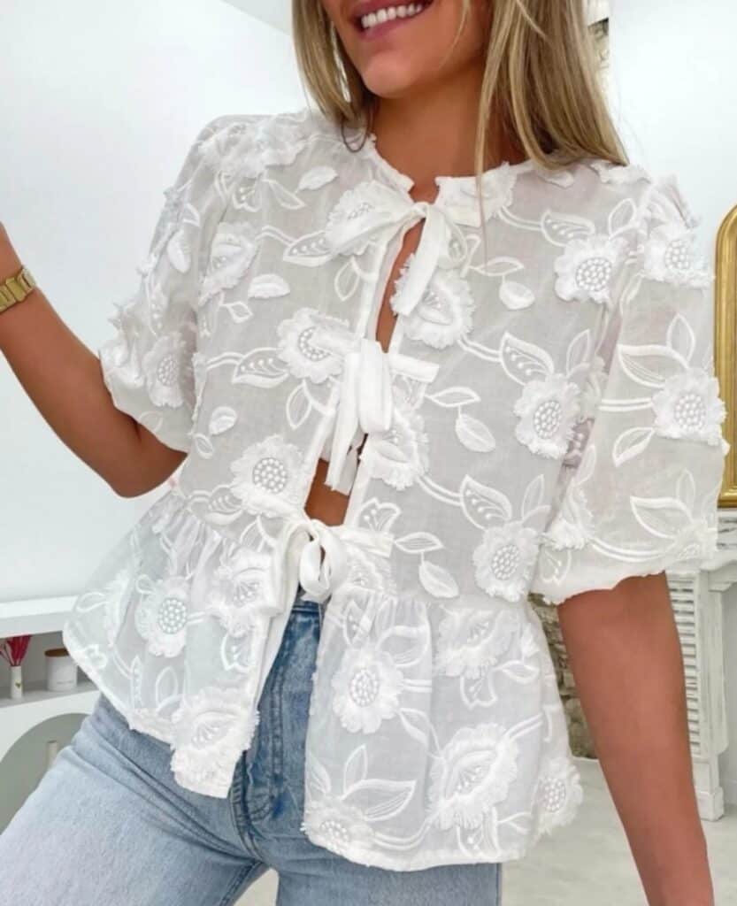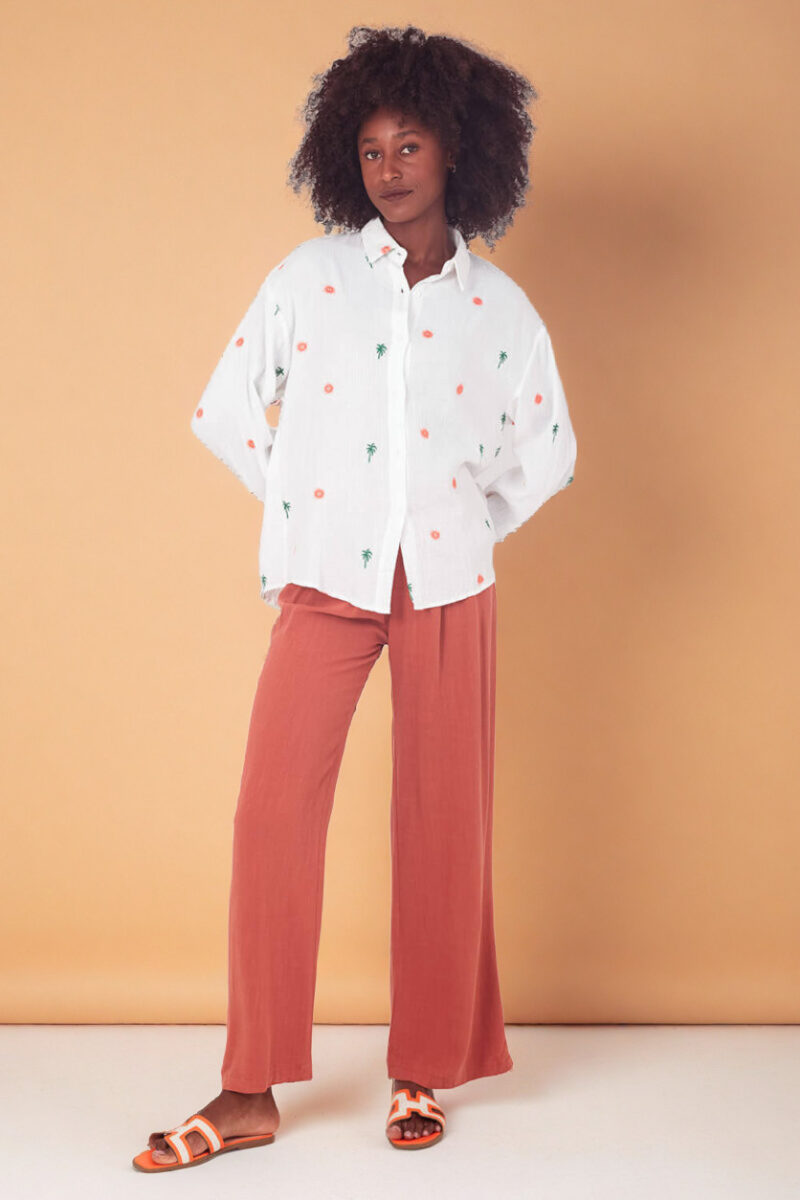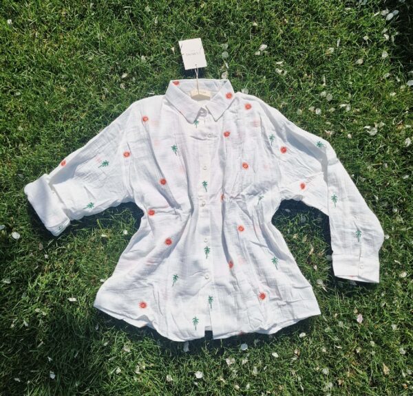 Breng de zon in je outfit, zelfs op een druilerige dag! Deze witte blouse met geborduurde palmboompjes en zonnetjes is jouw instant vakantiegevoel in kledingvorm. Gemaakt van 100% katoen met een heerlijke wafelstructuur β luchtig, comfortabel en zo zacht dat je hem eigenlijk niet meer uit wilt doen.