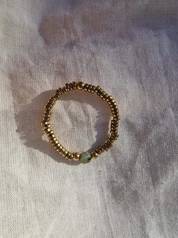 Voeg een vleugje elegantie toe aan je look met deze elastische gouden ring met een groene steentje! Deze combinatie zorgt voor een chique en trendy uitstraling, perfect om solo te dragen of te combineren met andere ringen.