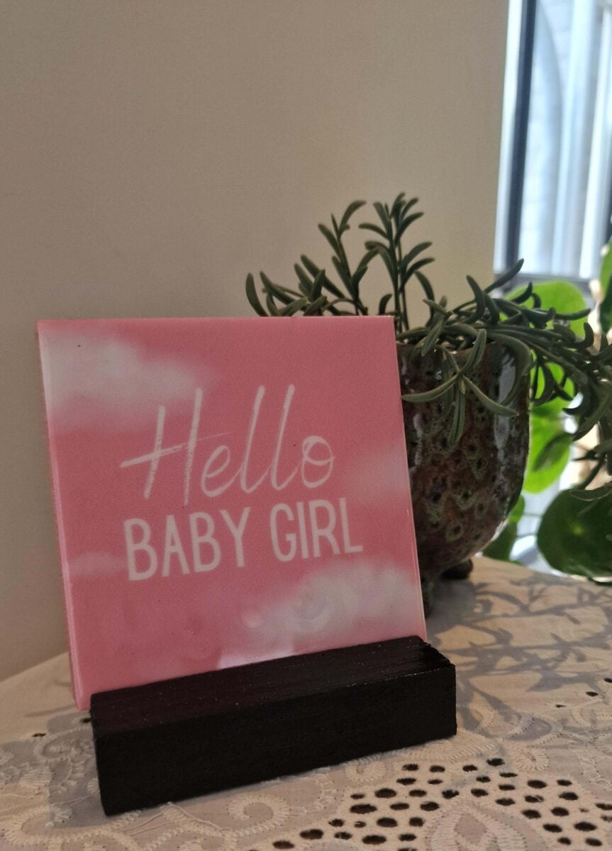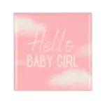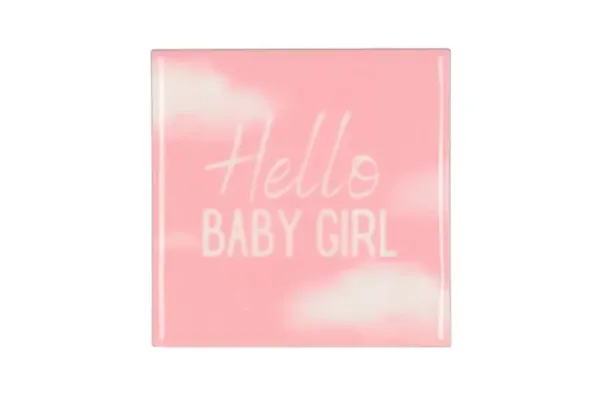Vier de komst van een meisje met dit schattige geglazuurde tegeltje met de tekst “Hello BABY Girl”. Uitgevoerd in babyroze met witte wolkjes, is dit tegeltje een perfect cadeautje of lieve decoratie voor de babykamer.