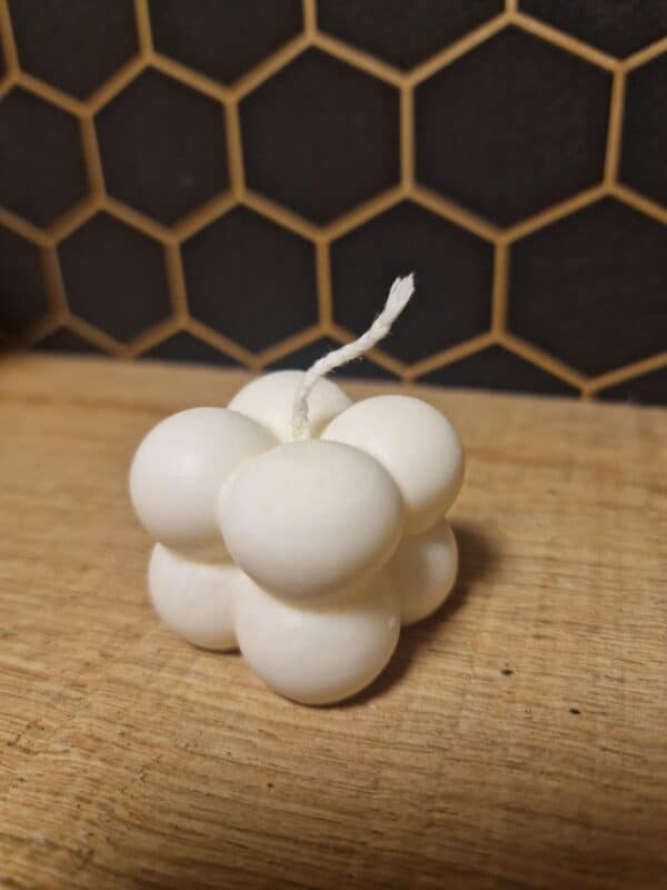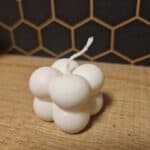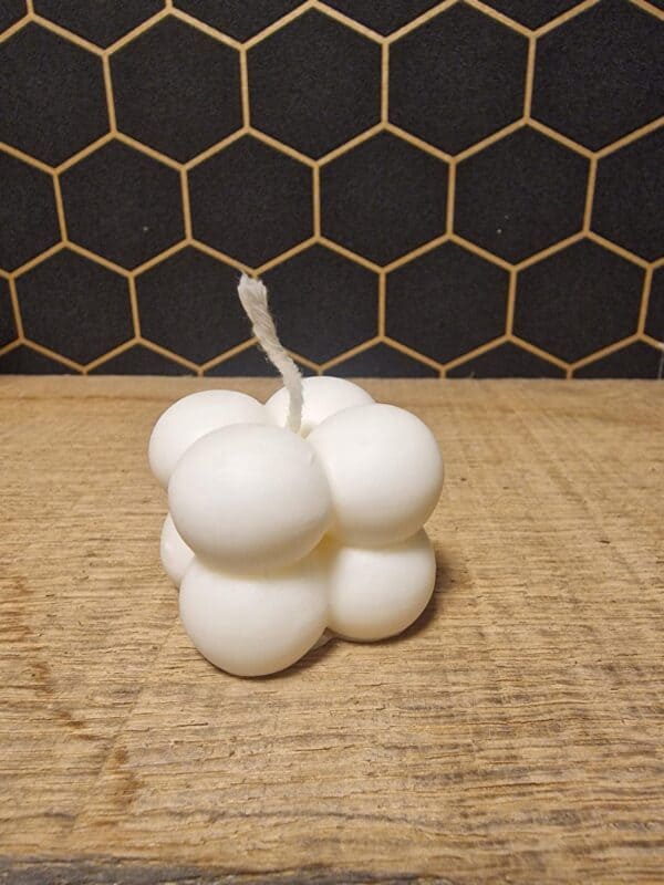 Ontdek de charme van onze mini bubble kaars, perfect als bedankje bij een huwelijk of als een uniek geboorte- of doopcadeau. Met een afmeting van slechts 3,5 x 3,5 x 3,5 cm, biedt deze kleine kaars een grootse uitstraling. Gemaakt van een mix van koolzaad- en sojawax, zijn onze kaarsen 100% vegan en hebben ze een indrukwekkende brandduur.