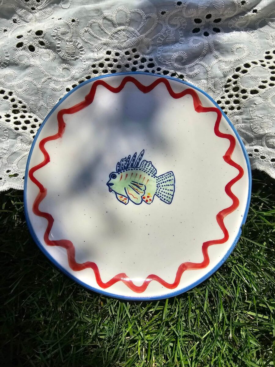 Breng kleur en sfeer aan je tafel met dit handgemaakte ontbijtbord uit de Ariane-lijn van Mica Decorations. De frisse witte basis, versierd met een vrolijk visje en een speels patroon van blauwe cirkels en rode golvende lijnen, maakt dit bord dé eyecatcher voor je zomertafel.