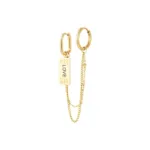 Maak een stijlvol statement met deze gouden oorhanger met ketting en LOVE-bedel! De speelse lengte van 9,5 cm zorgt voor een trendy en opvallende look, perfect om solo te dragen of te combineren met andere LOVE-sieraden.