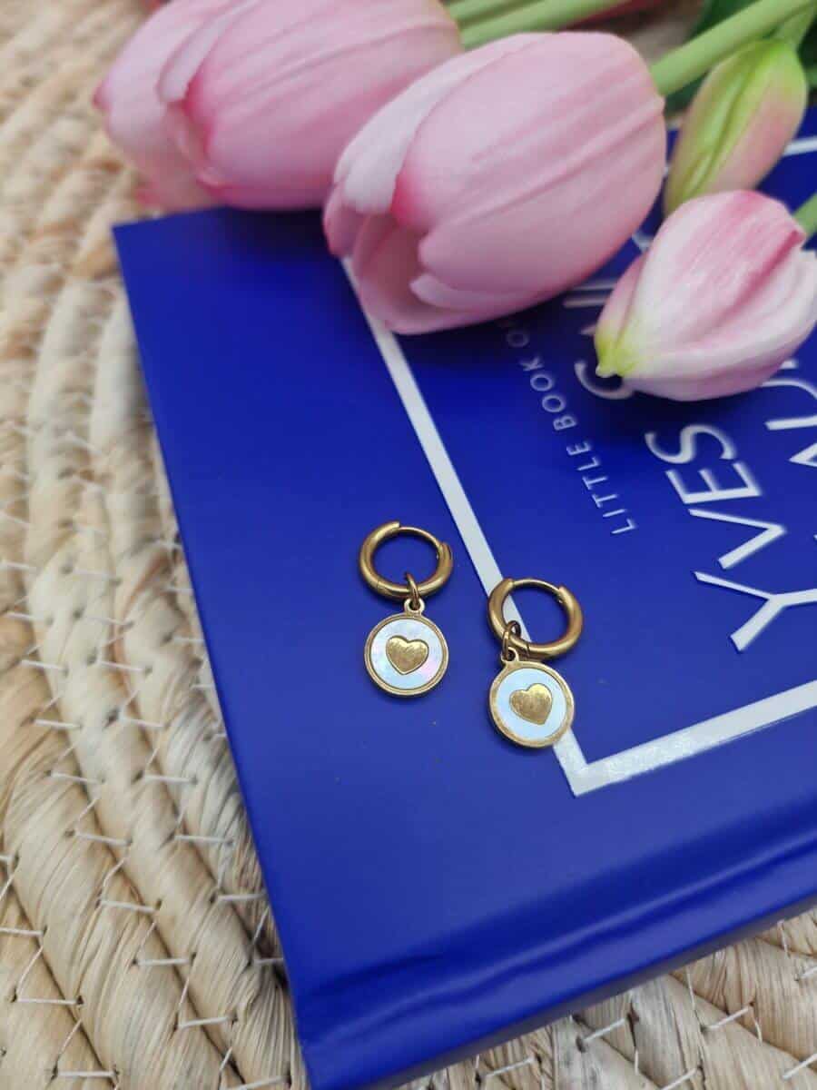 Roestvrij stalen creolen met rond bedeltje met hart – goud/parelmoer.