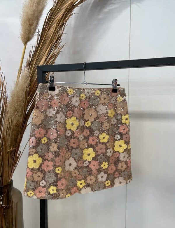 Deze prachtige paillettenrok met bloemen in zachte pasteltinten is een absolute eyecatcher! De delicate bloemenpatronen geven een romantische en speelse uitstraling, terwijl de subtiele glans van de pailletten ervoor zorgt dat je outfit net dat beetje extra krijgt.