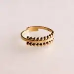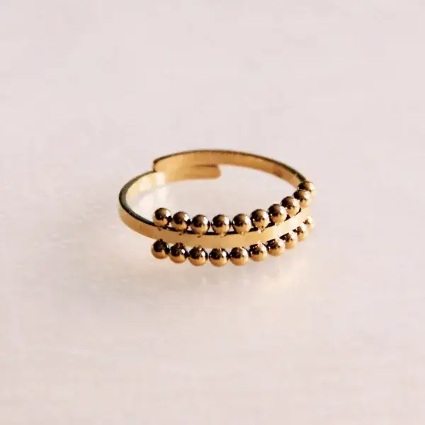 Hoe leuk is deze stijlvolle stalen verstelbare ring?! Afgewerkt met elegante gestippelde randen in een glanzende gouden kleur. Deze ring is niet alleen een blikvanger, maar ook een veelzijdige toevoeging aan elke sieradencollectie.