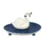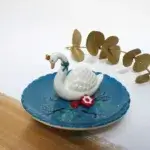 Hoe geweldig is dit exclusieve sieradenschaaltje met mooie zwaan?! Een koninklijke zwaan die nestelt op een diepblauwe vijver. De zwanenhals is dun genoeg om er ringen rondom te plaatsen om veilig te houden. Het nest is versierd met bloemenlijsten en het vijver oppervlak glinstert met bladgoud. Het schoteltje heeft een geschulpte rand en mooie gevormde voeten.