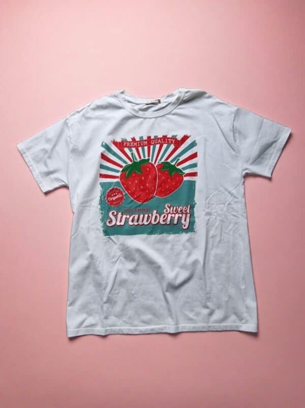 Haal de zomer in huis met dit witte T-shirt met vrolijke aardbeienprint! De frisse look en speelse print maken het een perfecte keuze voor elke casual outfit. Het luchtige design en de one size pasvorm zorgen voor comfort Ên stijl, of je het nu draagt met jeans, rokjes of shorts. Ga voor fruitig en fris â bestel nu en voeg een vleugje zoetheid toe aan je garderobe! đđ¤