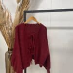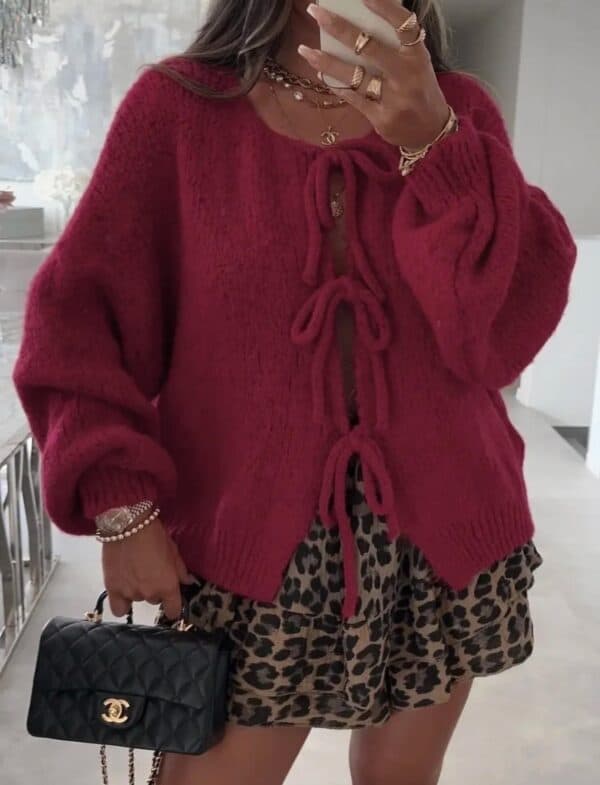 Voeg een vleugje charme toe aan je outfit met dit elegante beige vest, afgewerkt met fijne strikjes aan de voorkant om het stijlvol dicht te knopen. Dit vest combineert comfort met een speelse twist, perfect om je look op een subtiele manier op te fleuren. De prachtige Burgundy tint maakt het gemakkelijk te combineren met elke garderobe, terwijl de schattige strikjes zorgen voor een unieke en vrouwelijke uitstraling. Ideaal voor elke gelegenheid, van casual tot chic!
