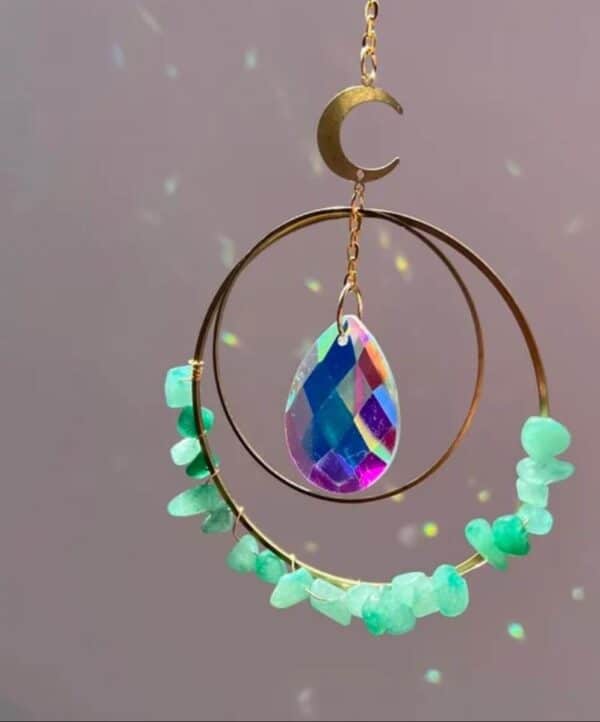 Ben jij ook zo’n fan van de betoverende effecten die de zon op kristallen heeft? Dan is deze groene Fluoriet suncatcher precies wat je zoekt! De kristallen zonnevanger vangt het zonlicht en creëert een sprankelend regenboogeffect, waardoor je ruimte gevuld wordt met een serene en magische sfeer.