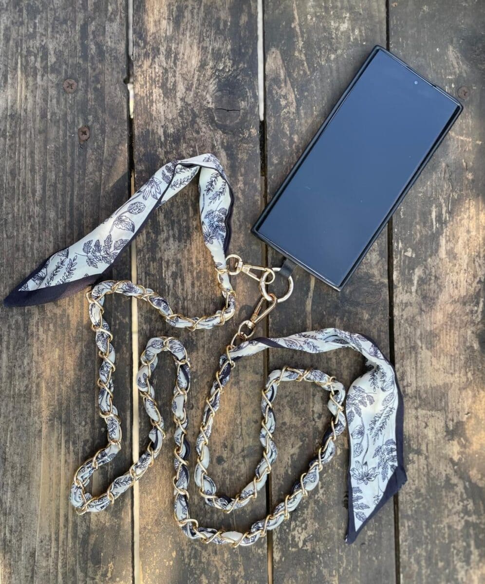 – Trendy design: Een stijlvolle gouden ketting met elegante Vintage Blue zijde-achtige stof om je telefoon om je nek of schouder te dragen.