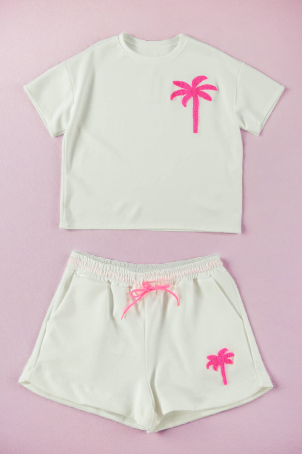 Deze witte set met matching T-shirt en short is dΓ© combinatie van cool & cute. Beide items zijn versierd met een felroze gehaakte palmboom β subtiel op het shortje, groots en in volle tropische glorie op het shirt. Bonus: het shortje heeft een felroze trekkoord dat nΓ©t dat beetje extra geeft.